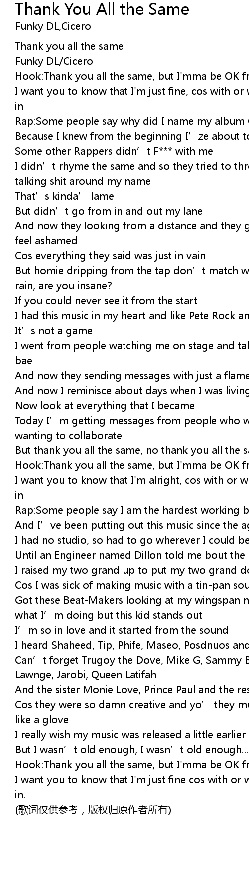 | [02:18.50] | Hook:Thank you all the same, but I'mma be OK from here on in |