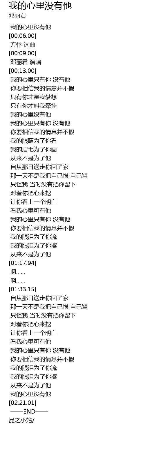 | [00:29.43] | wǒ de xīn lǐ zhǐ yǒu nǐ méi yǒu tā |