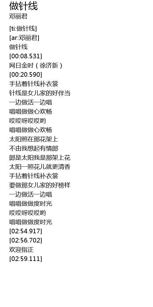 | [00:43.364] | 针线是女儿家的好伴当 |