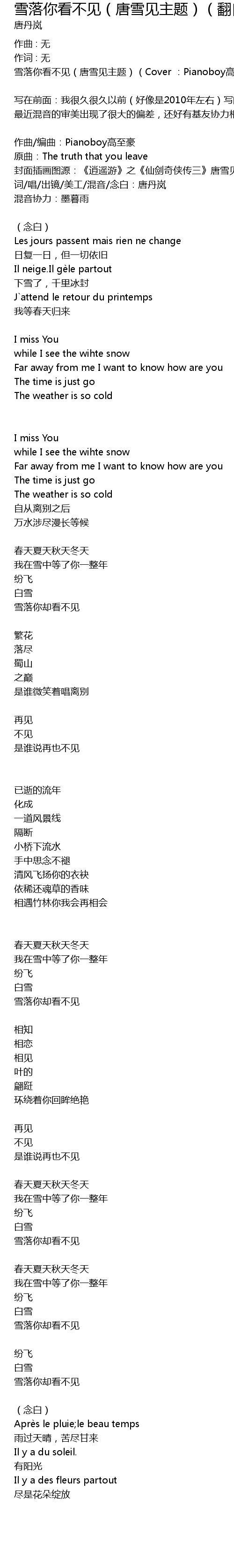 | xiě zài qián miàn: wǒ hěn jiǔ hěn jiǔ yǐ qián hǎo xiàng shì 2010 nián zuǒ yòu xiě de xiān jiàn qí xiá chuán sān táng xuě jiàn tóng rén gē cí, rú jīn fān chàng zhī. suàn suàn yào shì nà shí hou yǒu hái zi, xiàn zài dōu kě yǐ dǎ jiàng yóu le! shuō shí huà zì jǐ dōu kuài wàng jì zhè shǒu gē le, jié guǒ yǒu yì tiān shuǐ píng xiàn xiǎo jiě jie jiā rù le zhú xiū ba de QQ qún, xún wèn dāng nián de xuě luò nǐ kàn bú jiàn, suǒ yǐ zhè shǒu gē sòng jǐ shuǐ píng xiàn xiǎo jiě jie. | |
