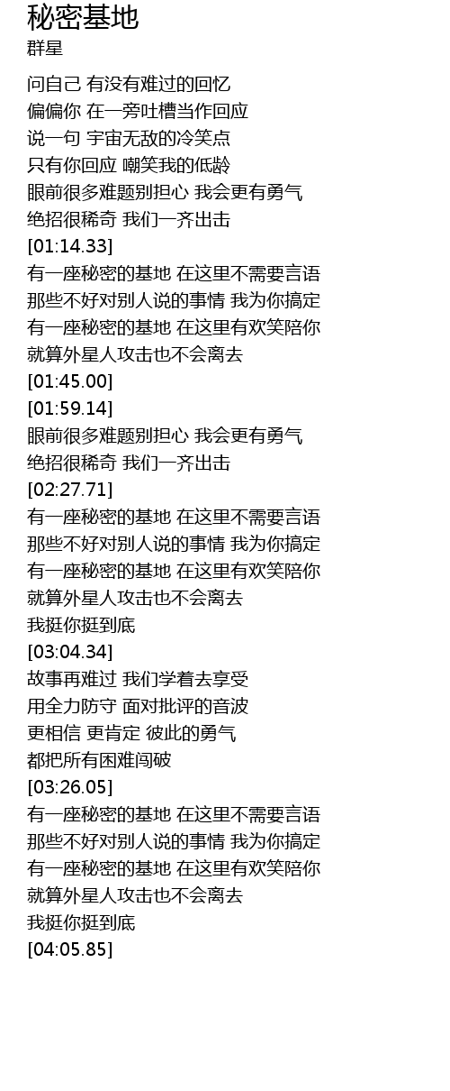 | [01:29.49] | 有一座秘密的基地 在这里有欢笑陪你 |