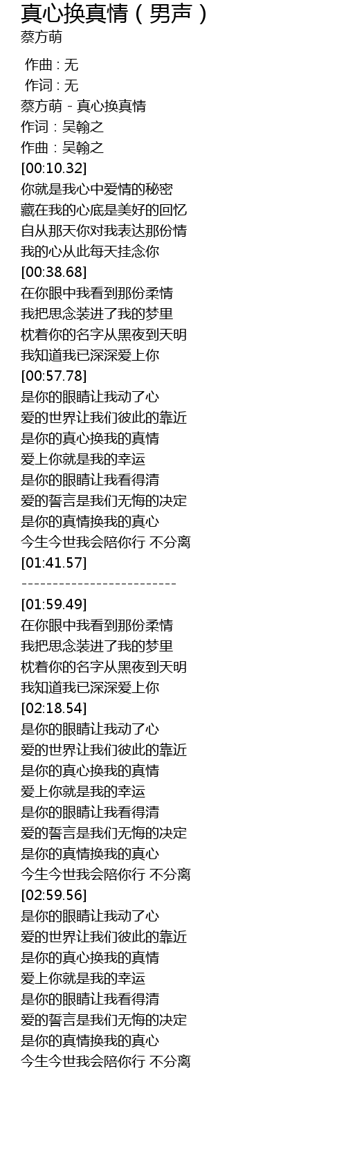 | [00:02.85] | 蔡方萌 - 真心换真情 |