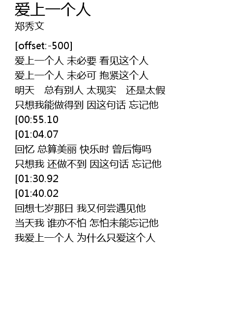 | [02:43.64][01:30.92] | 我爱上一个人 为什么只爱这个人 |