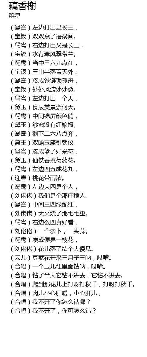 | [01:54.78] | (合唱)一个虫儿往里面钻呐,哎唷。 |