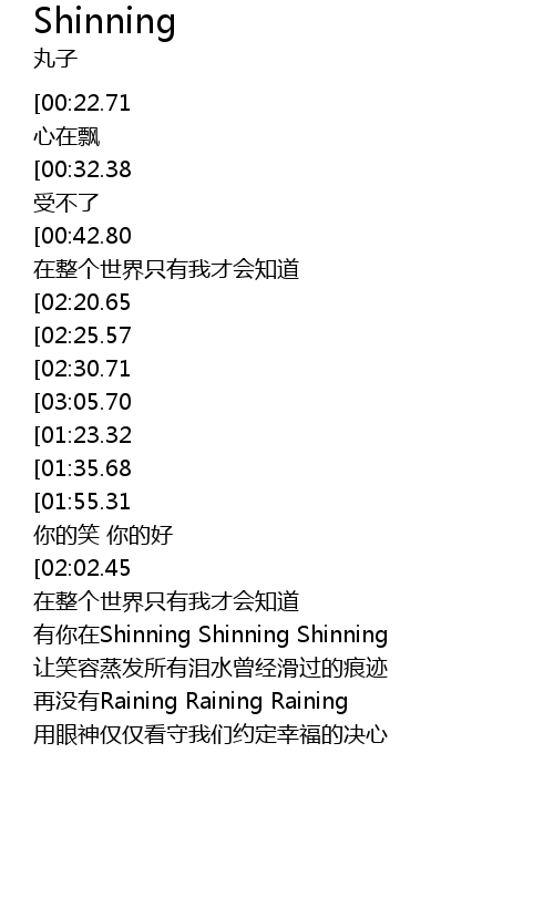 | [02:52.13][02:20.65][01:00.51] | yǒu nǐ zài Shinning Shinning Shinning |