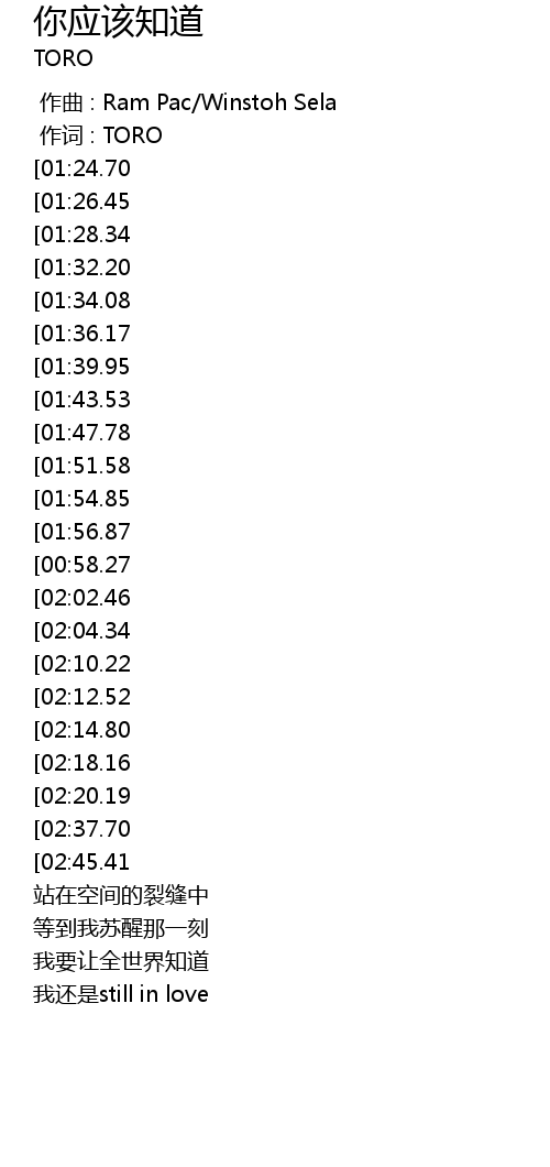 | [00:49.76][00:58.27][01:58.60][02:06.35][03:12.06][03:20.12] | 你早应该知道 |