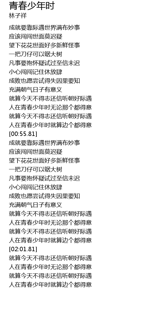 | [01:56.06] | 人在青春少年时就算边个都得意 |