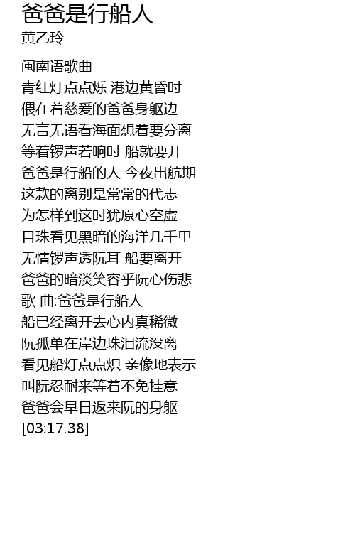 | [00:57.74] | 爸爸是行船的人 今夜出航期 |