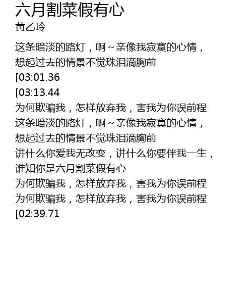 | [01:00.74][03:13.44] | 谁知你是六月割菜假有心 |