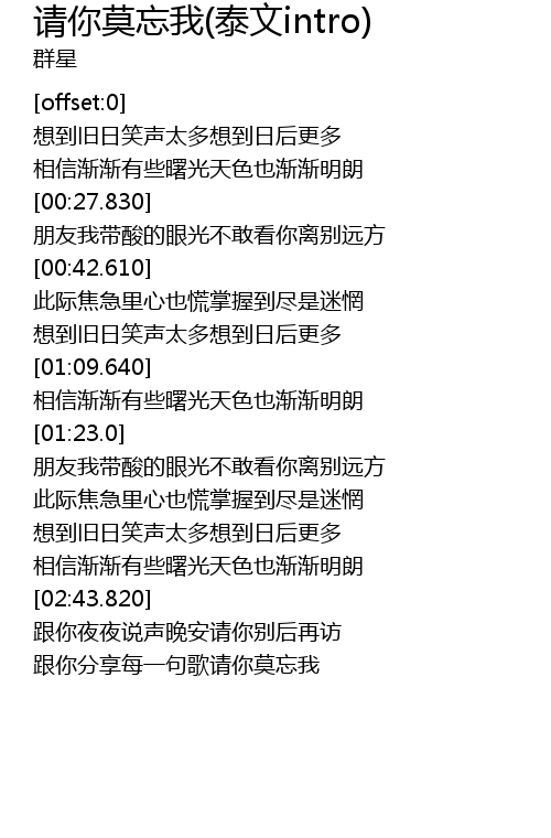 | [02:56.790] | gēn nǐ fēn xiǎng měi yī jù gē qǐng nǐ mò wàng wǒ |