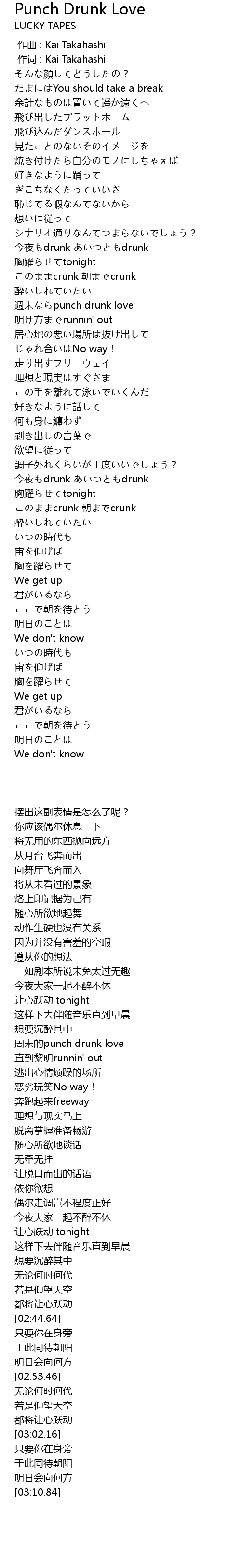 | [02:02.55] | 今夜もdrunk あいつともdrunk |
