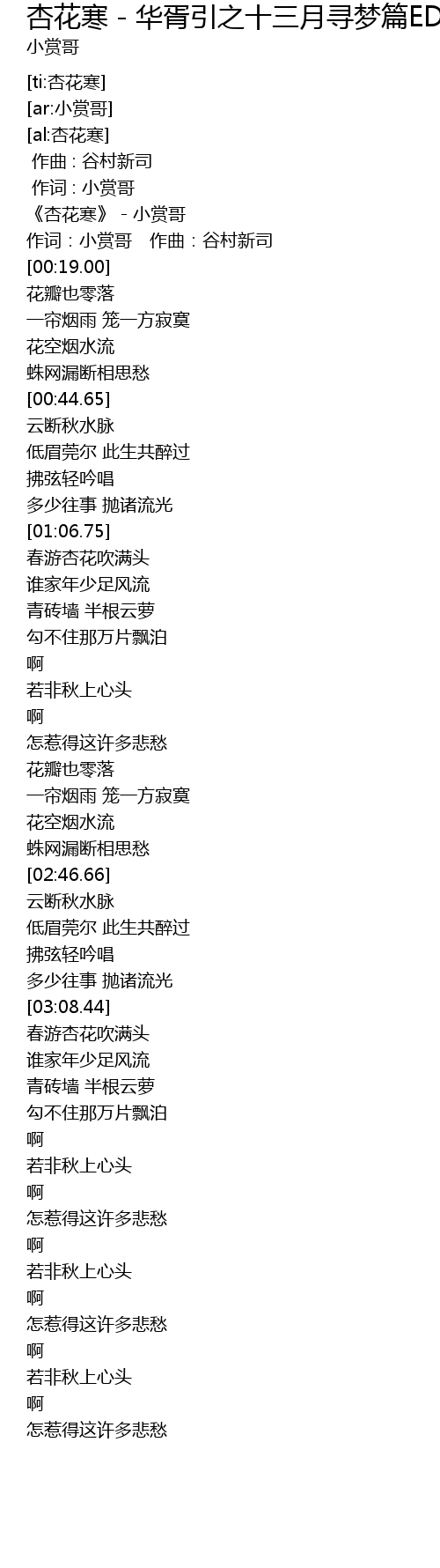 | [00:00.00] | 《杏花寒》 - 小赏哥 |