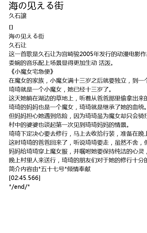 | [00:11.474] | 这一首歌是久石让为宫崎骏2005年发行的动漫电影作品《小魔女小魔女宅急便》的一首配乐, |