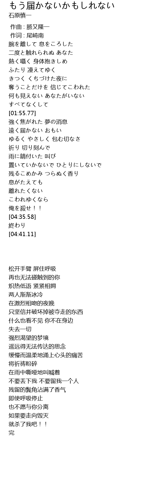 | [01:22.26] | 奪うことだけを 信じてこわれた |