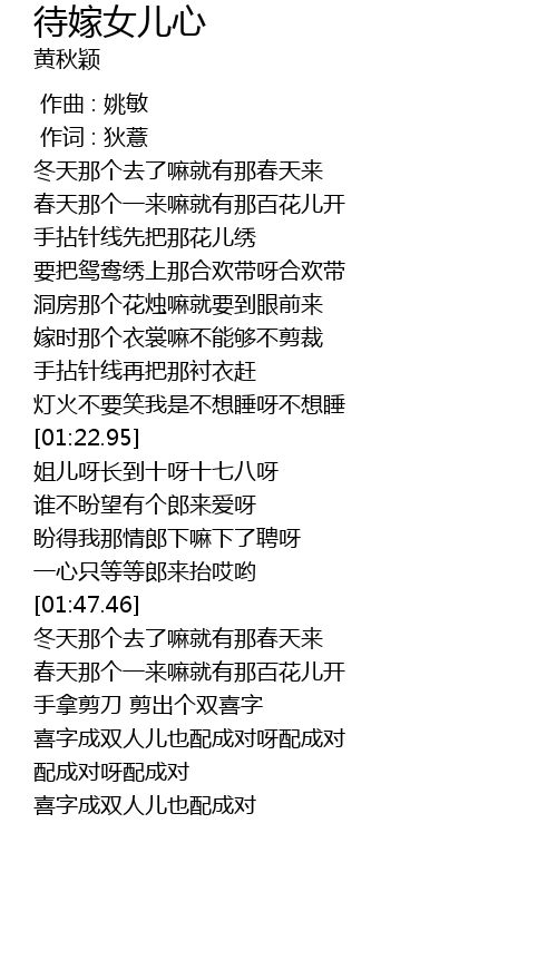| [01:43.30] | 一心只等等郎来抬哎哟 |