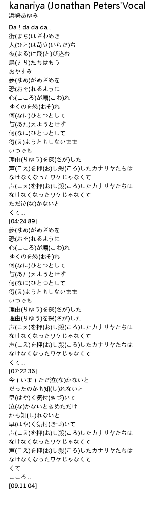 | [03:58.88] | 声(こえ)を押(お)し殺(ころ)したカナリヤたちは |