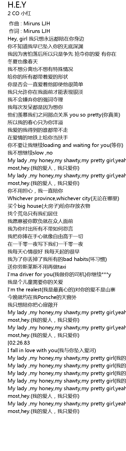 | [02:14.93] | My lady , my honey, my shawty, my pretty girl, yeah, I love you the most, hey. wo de ai ren, wo zhi ai ni |