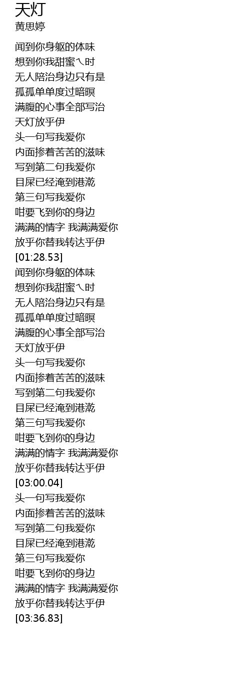 | [03:24.52] | mǎn mǎn de qíng zì wǒ mǎn mǎn ài nǐ |