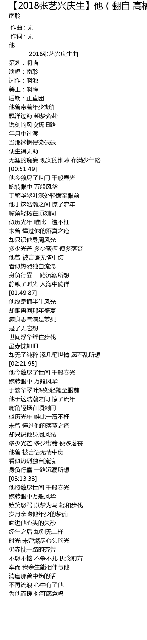 | [00:04.49] | 2018 zhang yi xing qing sheng qu |