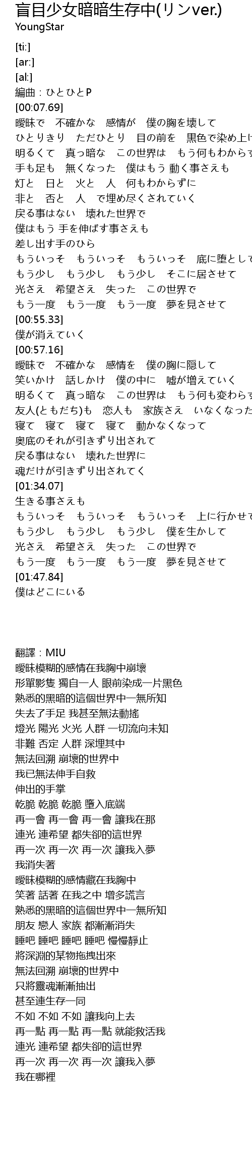 | [01:15.65] | 明るくて 真っ暗な この世界は もう何も変わらずに |