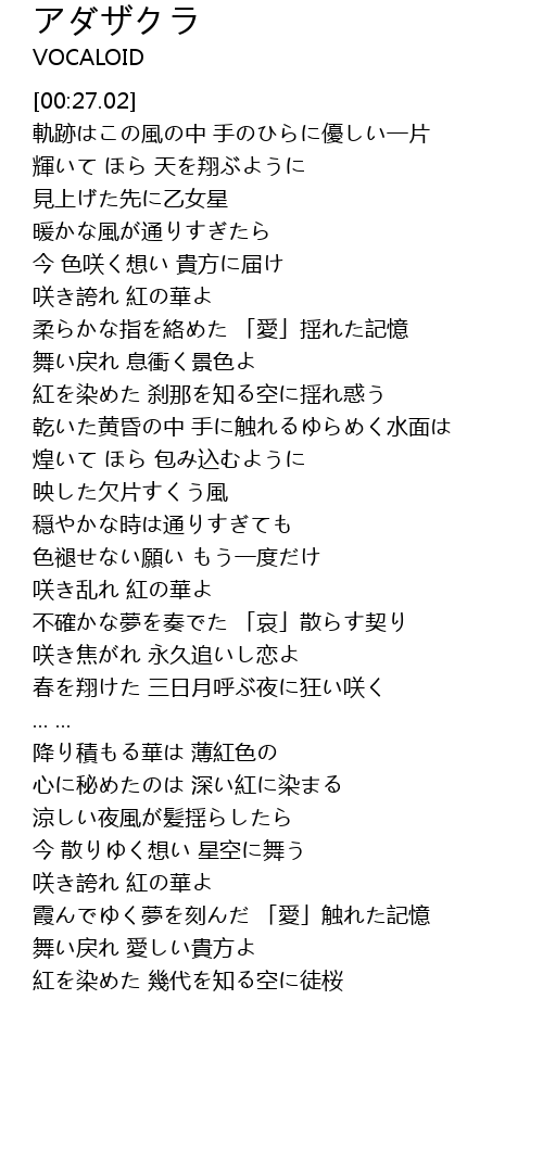 | [02:27.42] | 不確かな夢を奏でた 「哀」散らす契り |