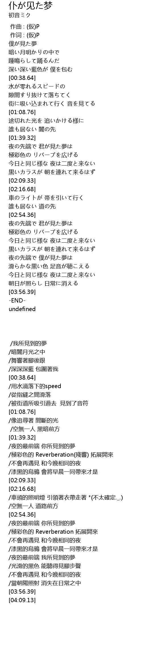 | [03:24.52] | 夜の先端で 僕が見た夢は |