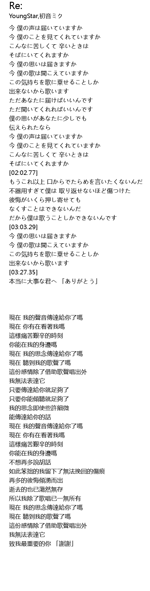 | [00:34.89] | 今 僕の声は届いていますか |