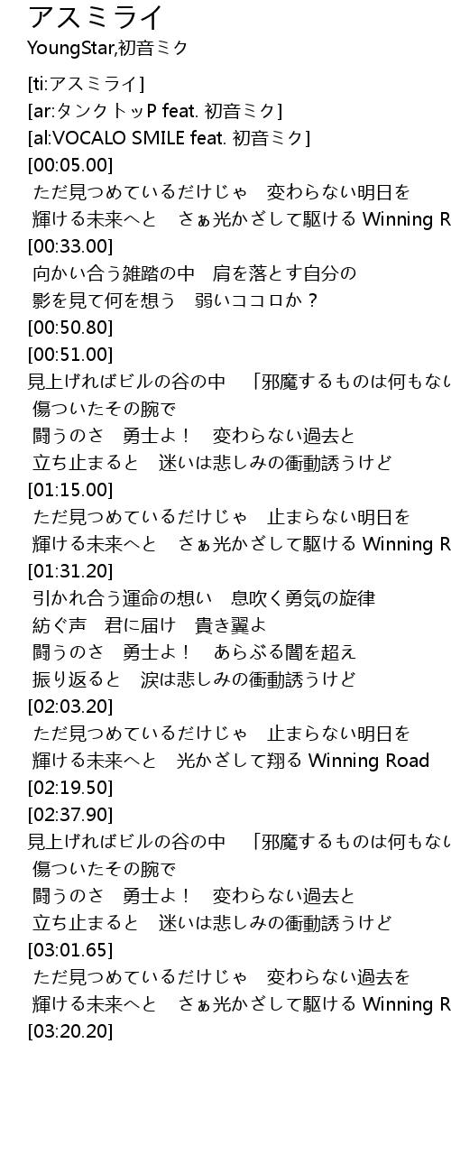 | [02:10.10] | 輝ける未来へと 光かざして翔る Winning Road |