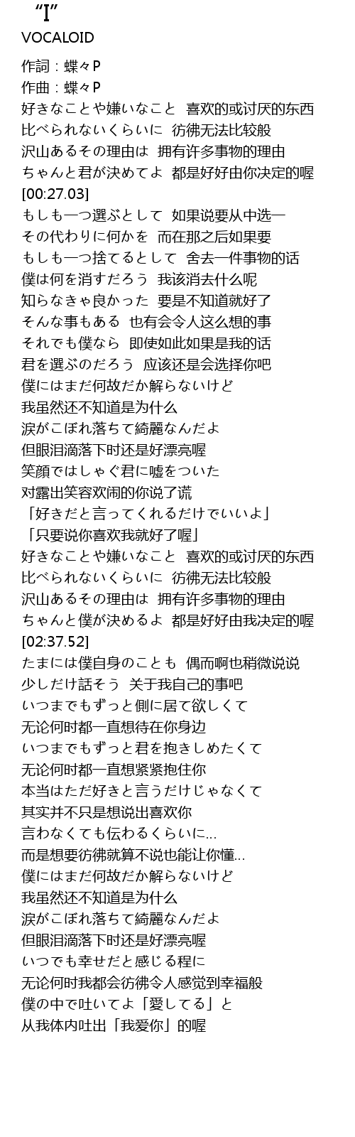 | [02:12.25] | 好きなことや嫌いなこと 喜欢的或讨厌的东西 |