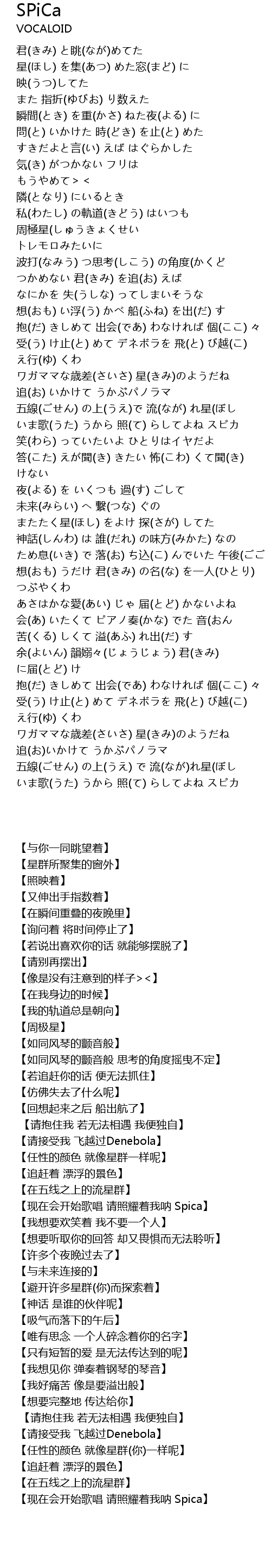 | [01:30.93] | いま歌(うた) うから 照(て) らしてよね スピカ |