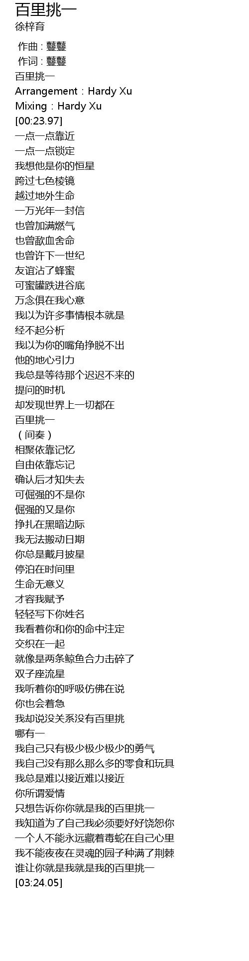 | [01:13.58] | bǎi lǐ tiāo yī |