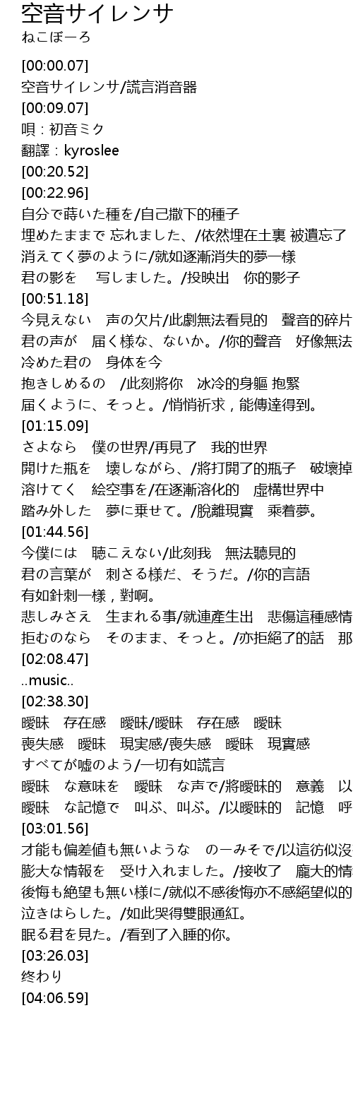 | [00:00.68] | 空音サイレンサ/謊言消音器 |