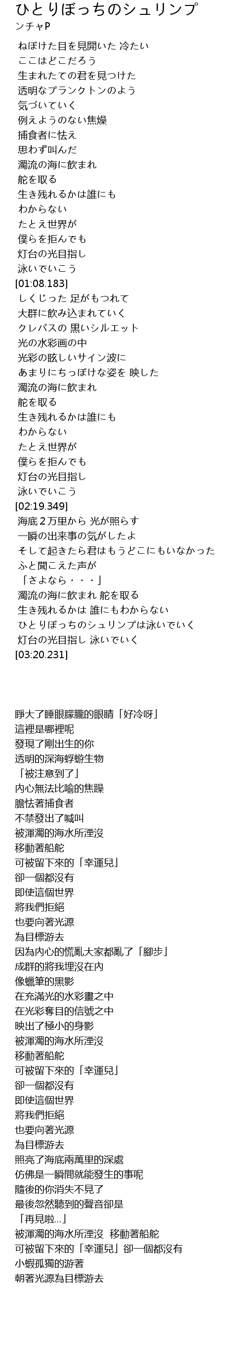 | [03:09.810] | ひとりぼっちのシュリンプは泳いでいく |