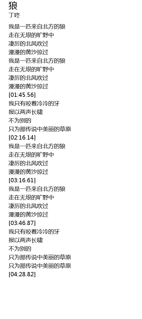 | [00:45.26] | 我是一匹来自北方的狼 |