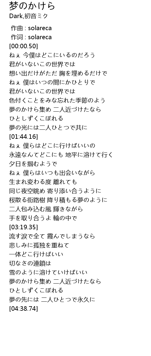 | [03:59.59] | 夢のかけら集め 二人近づけたなら |