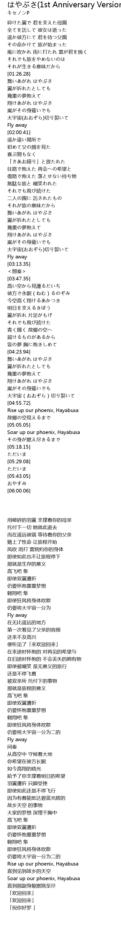 | [04:55.73] | Rise up our phoenix, Hayabusa |
