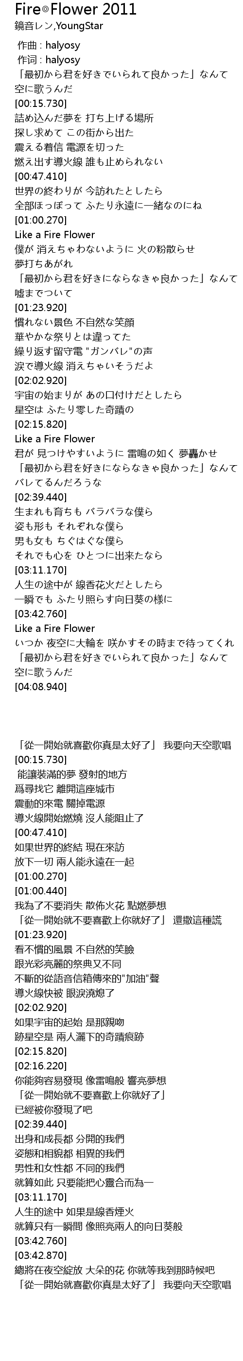 | [03:45.940] | いつか 夜空に大輪を 咲かすその時まで待ってくれ |