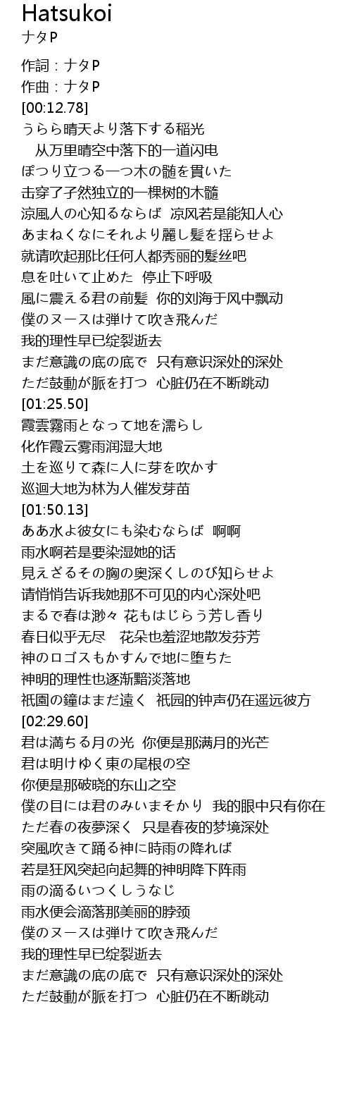 | [03:24.49] | 雨の滴るいつくしうなじ 雨水便会滴落那美丽的脖颈 |