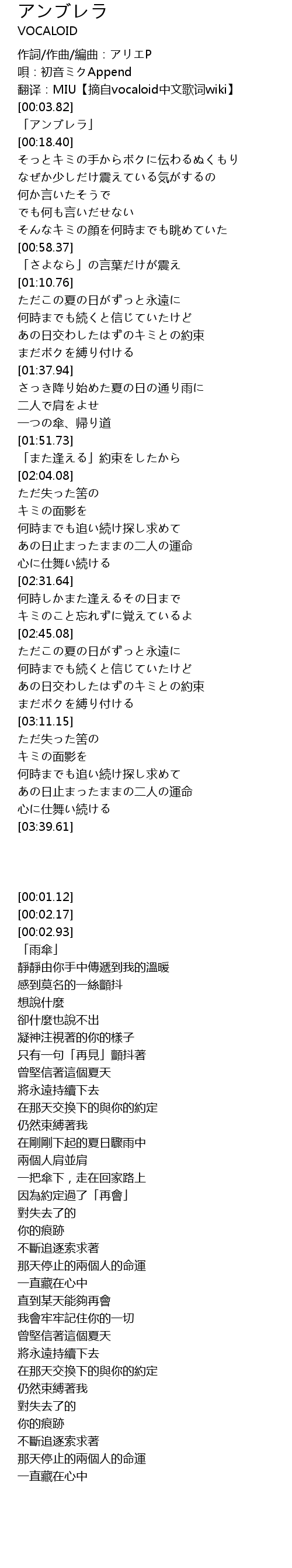 | [00:02.17] | 唄:初音ミクAppend |