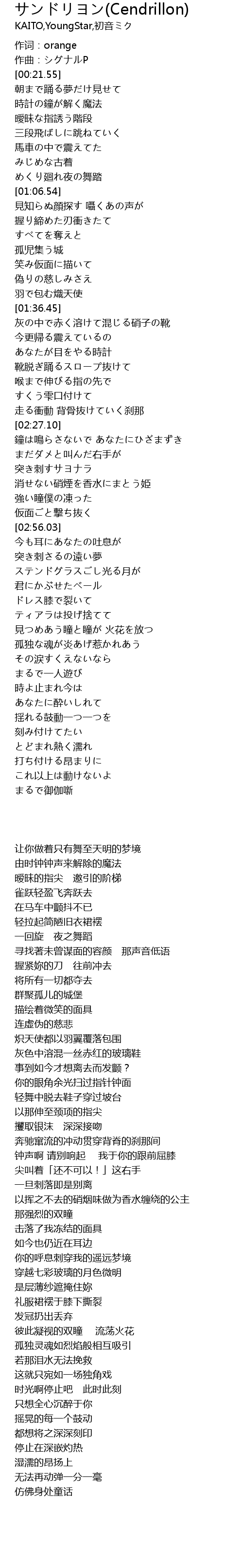 | [01:47.79] | 灰の中で赤く溶けて混じる硝子の靴 |