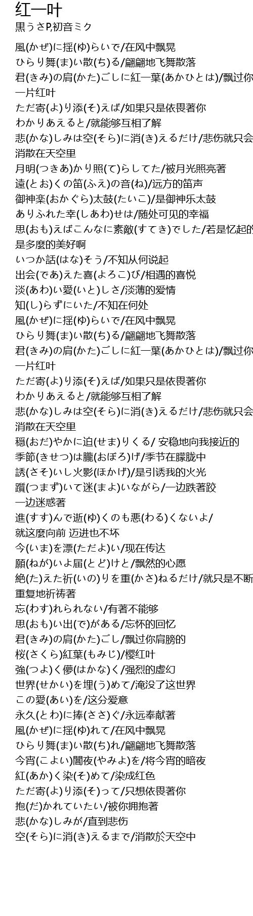| [00:25.470] | 君(きみ)の肩(かた)ごしに紅一葉(あかひとは)/飘过你肩膀的 一片红叶 |