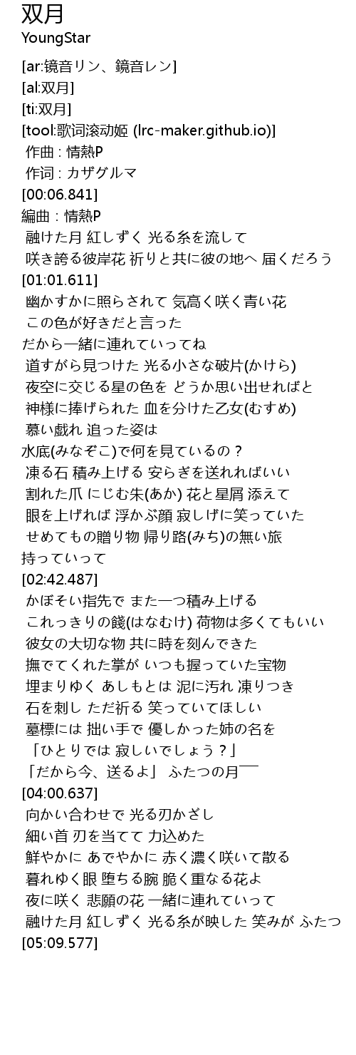 | [04:55.862] | 融けた月 紅しずく 光る糸が映した 笑みが ふたつ |