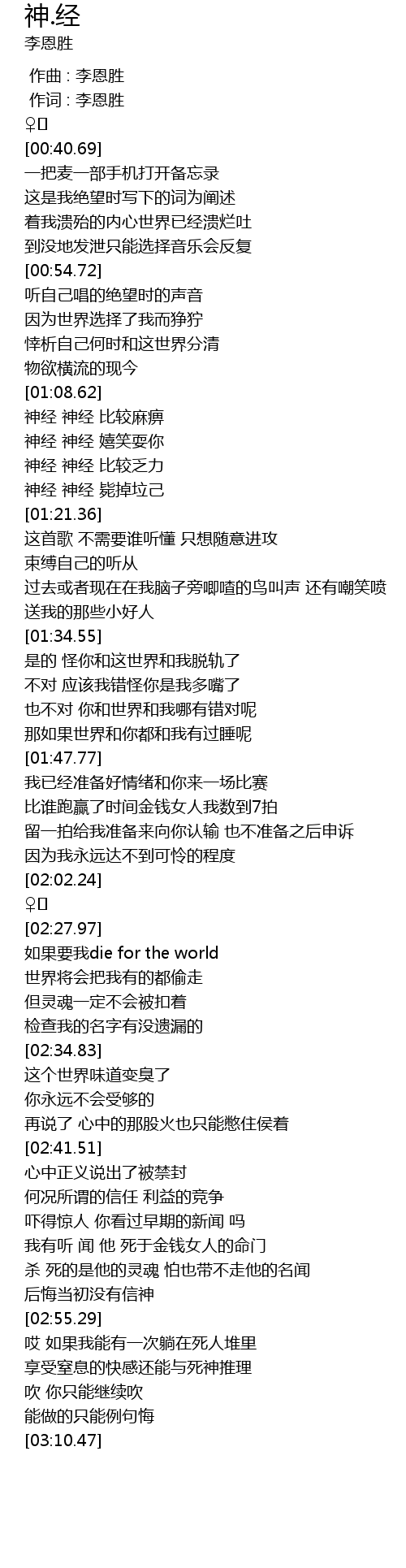 | [01:17.99] | 神经 神经 毙掉垃己 |