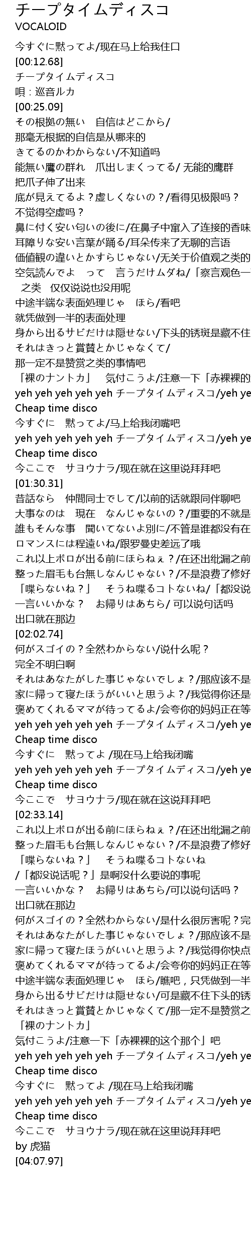 | [02:25.24] | yeh yeh yeh yeh yeh yeh yeh yeh yeh Cheap time disco |