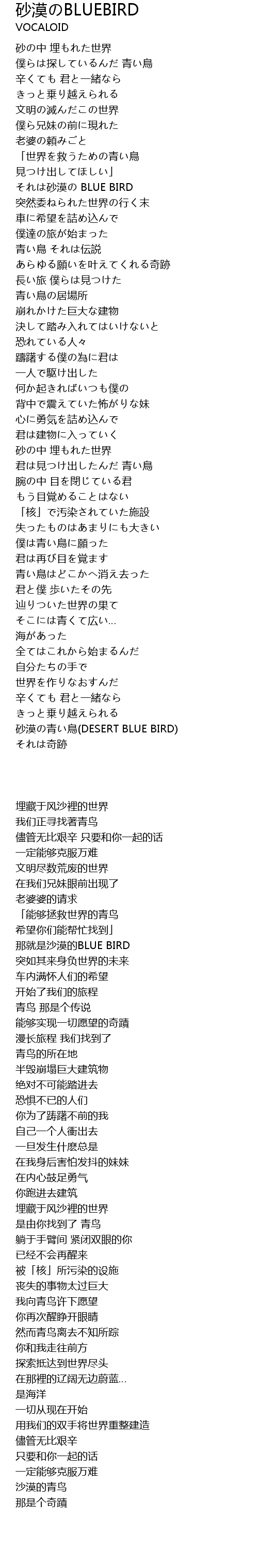 | [04:24.02] | shā mò qīng niǎo DESERT BLUE BIRD |