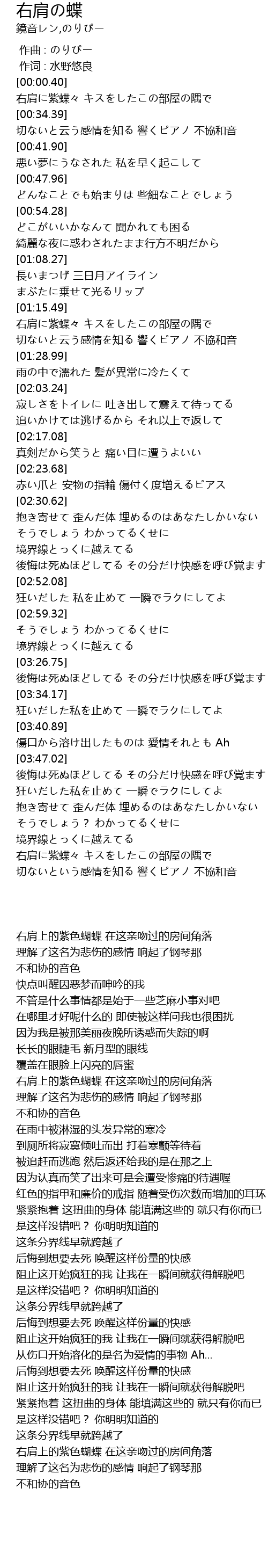 | [00:28.39] | 右肩に紫蝶々 キスをしたこの部屋の隅で |