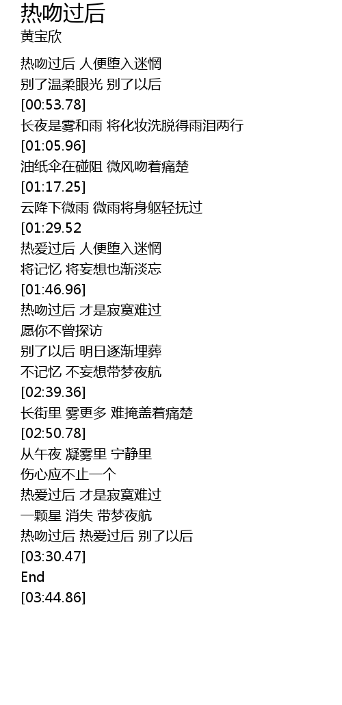 | [03:20.72] | rè wěn guò hòu rè ài guò hòu bié le yǐ hòu |