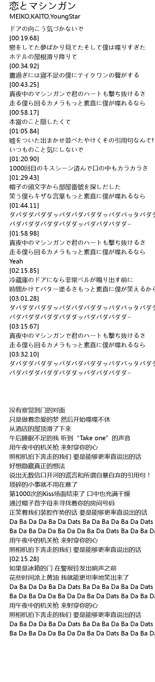 | [02:01.03] | 真夜中のマシンガンで君のハートも撃ち抜けるさ |