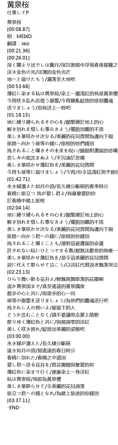 | [03:21.87] | 私は黄泉桜/我即為黃泉櫻 |