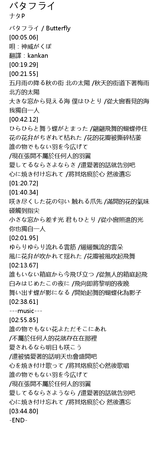 | [00:43.62] | ひらひらと舞う蝶がとまった /翩翩飛舞的蝴蝶停住 |